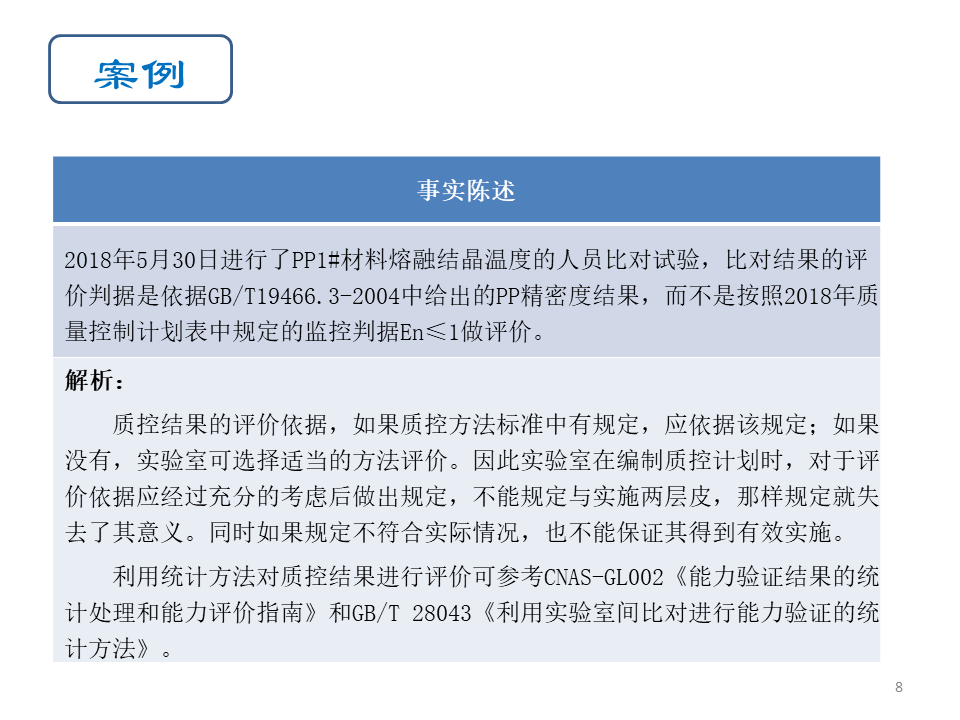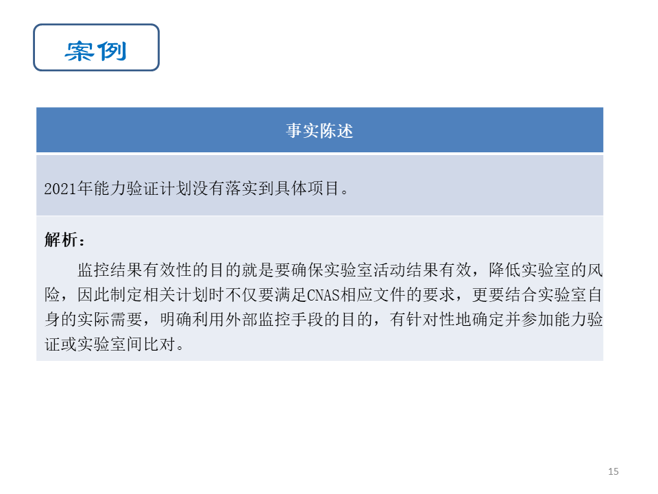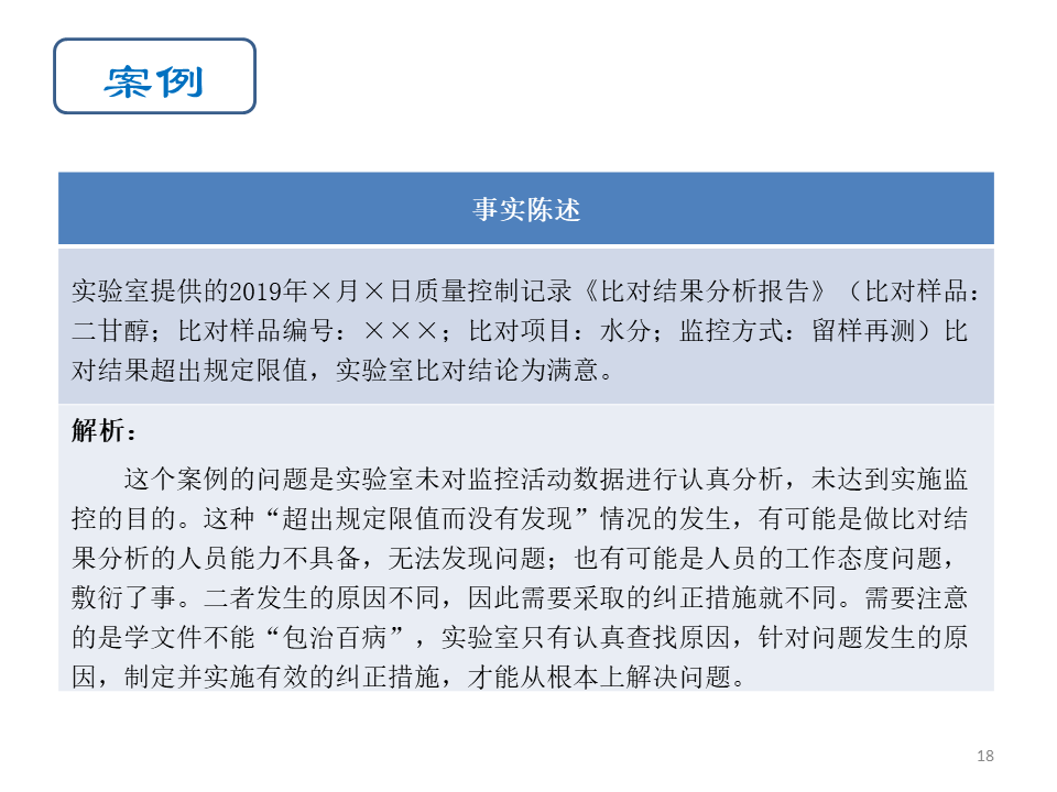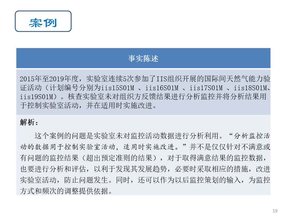 • 实验室最容易出现的问题就是为监控而监控,未将监控活动获得的数据用于控制和改进实验室活动,成为两层皮的状况。例如做完实验室间比对后,只存档2份检测报告,没有对结果进行分析,也未用于控制实验室活动,这样就失去了实施监控的意义。